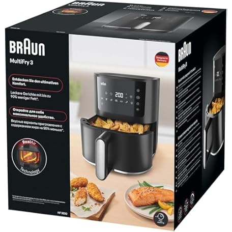 Thương hiệu Braun là cái tên nổi tiếng được rất nhiều khách hàng trên thế giới chọn lựa. Với kiểu dáng đẹp mắt, sang trọng, sản phẩm Braun MultiFry 3 HF 3030 Hot Air Fryer, 4.3 L, 1500 W, Digital Temperature Control, 80-200 °C, Timer, 8 Programmes, Touch Control, Non-Stick Coating, Cooking Basket & Grate, Dishwasher Safe, Black là sự lựa chọn hoàn hảo nếu bạn đang tìm mua một món cho riêng mình.
