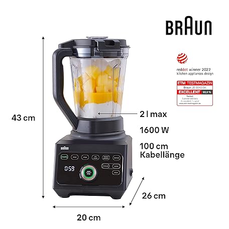 Thông tin sản phẩm Braun PowerBlend 9 JB9040BK High Performance Blender with 1600 Watt Motor, 2 L Tritan Container, 18 Programmes, 10 Speeds, Black
