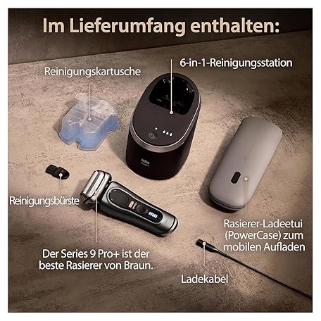 Thông tin sản phẩm Braun Series 9 Pro+ Men's Electric Shaver with 5 Pro Razor Elements, Long Hair Trimmer ProTrimmer & Cleaning Station, 60 Minutes Running Time, Made in Germany, 9565cc, Precious Metal
