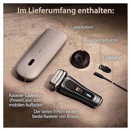 Thông tin sản phẩm Braun Series 9 Pro+ Men's Electric Shaver with 5 Pro Razor Elements, Long Hair Trimmer, Razor Charging Case, PowerCase, 60 Minutes Running Time, Made in Germany, 9525s, Precious Metal