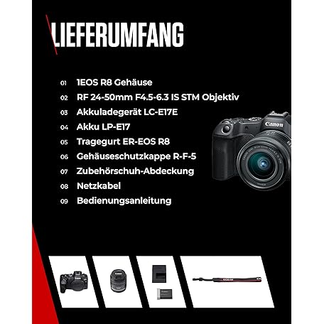 Thông tin sản phẩm Canon EOS R8 + RF 24-50mm F4.5-6.3 - System Camera with 24.2MP, Dual Pixel AF II, Integrated Image Combination, LCD Touch Screen, UVC/UAC Compatible - Designed for Full Frame Creativity