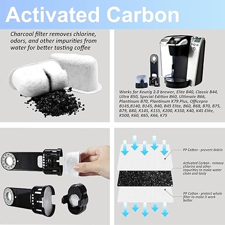 Thông tin sản phẩm Carbon Filter Compatible with Keurig Keurig 2.0 and 1.0 Classic K-Cup Pad Coffee Machines, Water Filter and 120 Wooden Coffee Stirrers, Pack of 24