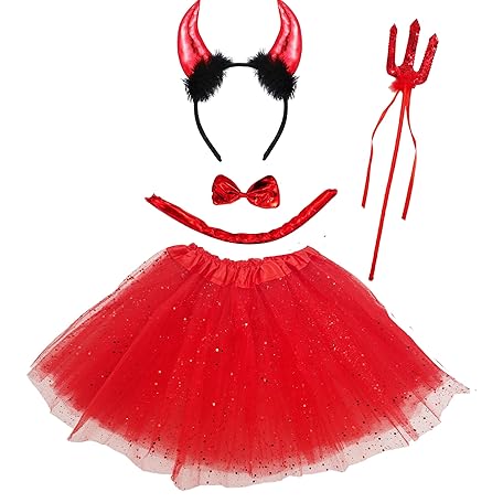 • Carnavalife Teufelskostüm, Teufel, Dämon, Mädchen, Halloween-Kostüm, Teufelskostüm, Halloween-Kostüm, teuflisches Stirnband, Schleife, Schwanz, Tuturock, Dreizack Teufel (40 cm/Erwachsene,