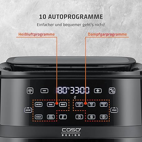 Thương hiệu Caso là cái tên nổi tiếng được rất nhiều khách hàng trên thế giới chọn lựa. Với kiểu dáng đẹp mắt, sang trọng, sản phẩm CASO AirFry & Steam 700 - Hot Air Fryer and Steamer - Test Rating: Very Good, Extra Large Basket Volume 7 Litres, Steamer & Air Fryer, Deep Fryer without Oil/Grease, Black là sự lựa chọn hoàn hảo nếu bạn đang tìm mua một món cho riêng mình.