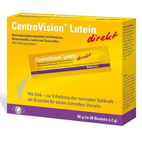 Sản phẩm CentroVision Lutein Direct Granules with a Micronutrient Combination of Lutein and Zeaxanthin, Eye Supplement with Essential Vitamins & Minerals, Lactose-Free, Pack of 28 đang được bán với giá ưu đãi là 0 tại nước Đức.