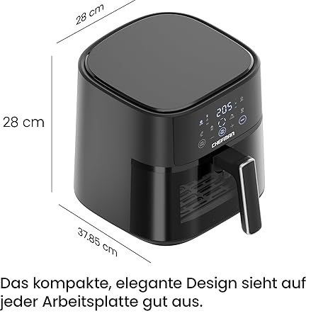 Thông tin sản phẩm Chefman Heißluftfritteuse - 5,7 L kompakte Heissluftfritteuse, mit Hi-Fry Technologie, Sichtfenster, Touch Controls, antihaftbeschichtet und spülmaschinenfest - Schwarz