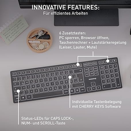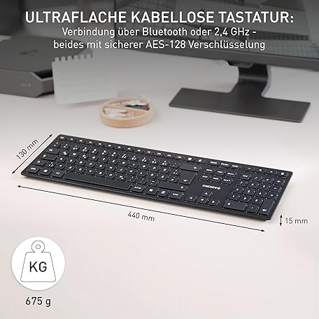 Thông tin sản phẩm CHERRY KW 9100 SLIM Wireless Design Keyboard, German Layout (QWERTZ), Choice of Bluetooth or 2.4 GHz Radio, Flat Keys, Rechargeable, Black/Grey