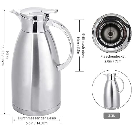 Thông tin sản phẩm Chesnia Thermoskanne Isolierkanne, 2.3 L Edelstahl Edelstahl Thermokaraffe, Doppelwand Vakuum Wasserkaraffe, Halten Sie Tee, Milch und Getränke Heiß oder Kalt