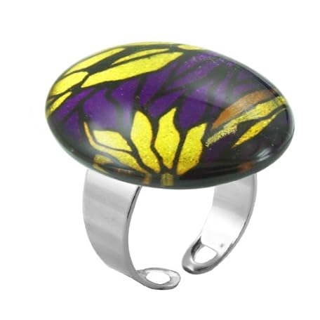 CHICNET Chic-Net Women's Glass Ring Hand-Painted Glass Rings Stainless Steel Adjustable Oval Flowers Purple Yellow, Glass, Glass