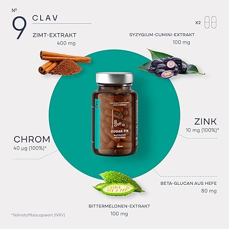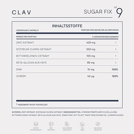 Sản phẩm CLAV® N°9 Sugar Fix - Blood Sugar Capsules with 400 mg Cinnamon Extract, 40 μg Chrome & 10 mg Zinc per Daily Dose Plus Beta Glucan, Jambul Tree and Bitter Melon - Blood Sugar Balance - 60 Capsules - đang được bán với giá ưu đãi là $31.5228 tại nước Đức.