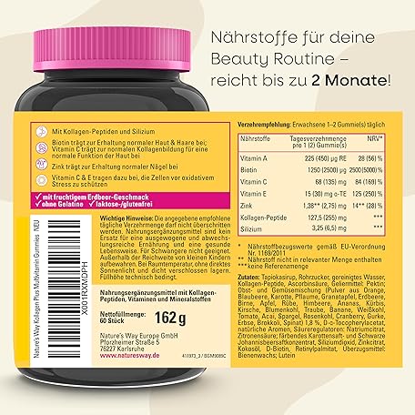 Thương hiệu NATURE'S WAY là cái tên nổi tiếng được rất nhiều khách hàng trên thế giới chọn lựa. Với kiểu dáng đẹp mắt, sang trọng, sản phẩm Collagen Gummy Bears with 2500 μg Biotin, Strawberry Flavour, 255 mg Collagen Peptides with Zinc Against Blemished Skin and Silicon, Skin and Hair Vitamins, Vegetarian Vitamin Gummies, Pack of 60 là sự lựa chọn hoàn hảo nếu bạn đang tìm mua một món cho riêng mình.