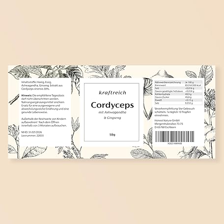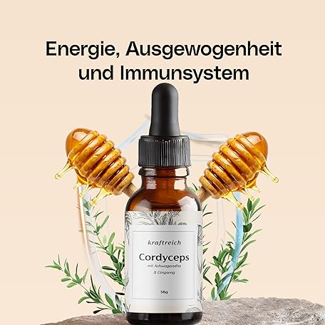 Thông tin sản phẩm Cordyceps Drops - High Quality Vital Mushroom Cordyceps with Ashwaghanda, Gingseng, Honey & Vinegar - For Energy, Strength and Strengthening of the Immune System - 3 Months Range - Drops - Natural