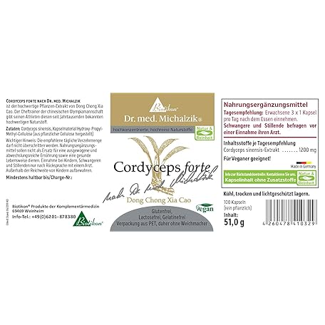 Sản phẩm Cordyceps forte Dr. Michalzik - 100 capsules - 400 mg per capsule Cordyceps sinensis extract - no additives - from BIOTIKON® đang được bán với giá ưu đãi là $37.8775 tại nước Đức.