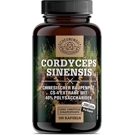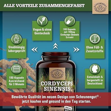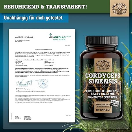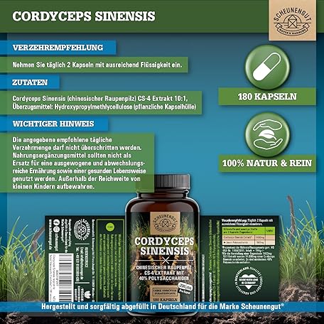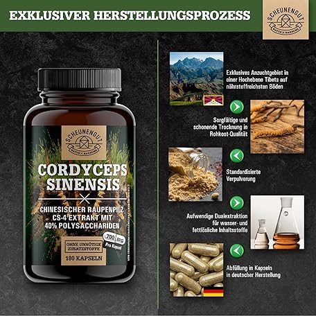 Thông tin sản phẩm Cordyceps Sinensis - 1400 mg per daily dose - IMPORTANT: 10:1 extract (= 14,000 mg coryceps per dose) I with 40% bioactive polysaccharides I 180 Cordyceps capsules (CS-4 extract) I from DE I Schaunengut