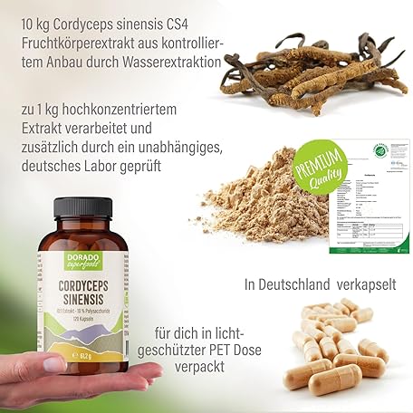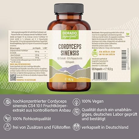 Sản phẩm Cordyceps Sinensis Capsules - 1,640 mg Extract Daily (10:1, Equivalent to 16,400 mg Raw Mushroom) - 120 Pieces (1 Month Supply) - 10% Polysaccharides - Highly Concentrated | Dorado Superfoods đang được bán với giá ưu đãi là $17.4945 tại nước Đức.