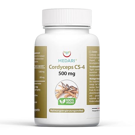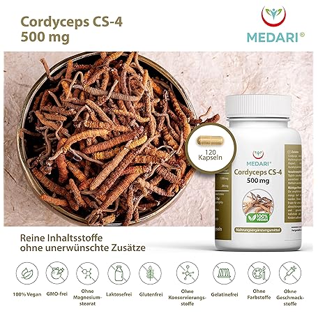 Sản phẩm Cordyceps Sinensis CS-4 Capsules (120 x 500 mg) Mushroom Capsules with 20% Valuable Pure Ingredients, No Additives, 100% Vegan đang được bán với giá ưu đãi là $25.3207 tại nước Đức.
