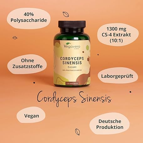 Sản phẩm Cordyceps Sinensis Vegavero | 650 mg CS-4 Extract (10:1) | Comparison Winner 2024* | 40% Polysaccharides | Vegan from Fermentation | Corresponds to 6500 mg per Capsule | No Additives | Pack of 120 đang được bán với giá ưu đãi là $29.0049 tại nước Đức.