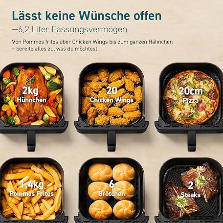 Thông tin sản phẩm COSORI Airfryer, Heißluftfritteuse 6,2L mit Sichtfenster und Shake Reminder, 12-in-1 Heissluftfritteuse, Fritteuse 85 Prozent weniger Fett, 50 Rezepte, 55 Prozent energiesparend, einfache Reinigung