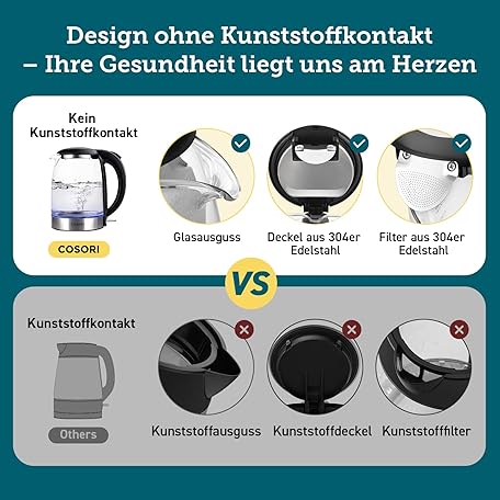 Thông tin sản phẩm COSORI Glas Wasserkocher 1,7 L, kocht in 2 Minuten, wasserberührende Teile plastikfrei, 304er Edelstahl-Kalkfilter, 2200 W, Überhitzungsschutz, 360° drehbarer Sockel, Schwarz
