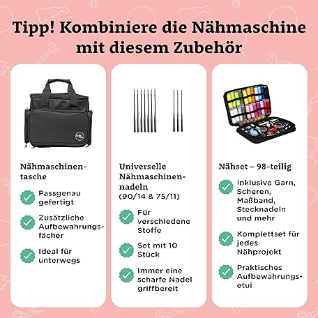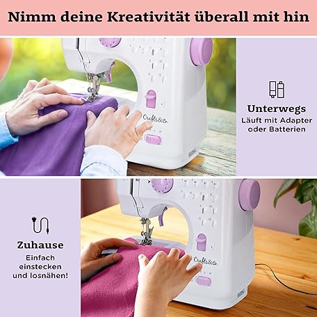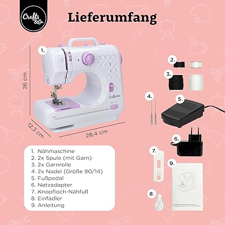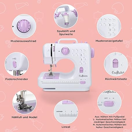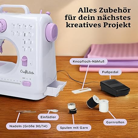 Sản phẩm Crafts&Co® Nähmaschine für Anfänger mit Eingebautem LED-Licht und Fußpedal | 12 Stiche | Mini Nähmaschine inkl. Overlock | Singer | Pfaff | Weiß-Lila đang được bán với giá ưu đãi là $50.5542 tại nước Đức.