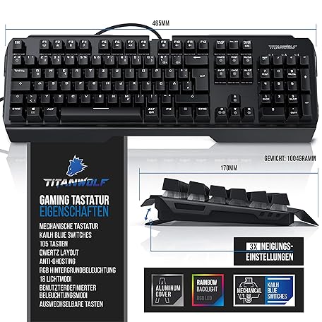 Sản phẩm CSL-Computer Titanwolf - Mechanical Keyboard Alumar - Mechanical Keyboard Gaming - Gaming Keyboard - Anti-Ghosting - QWERTZ Layout DE - Full Key Rollover - RGB LED Backlight đang được bán với giá ưu đãi là $71.7329 tại nước Đức.