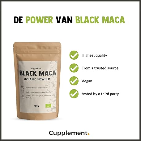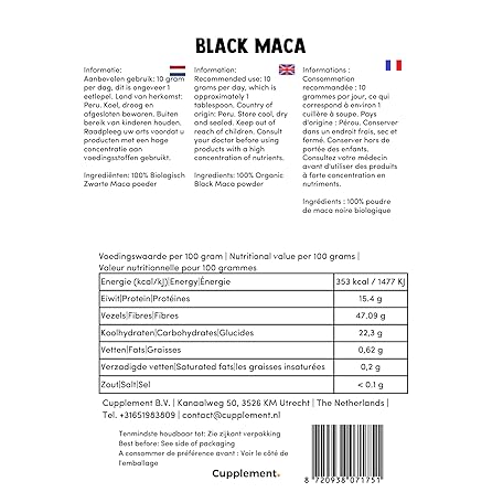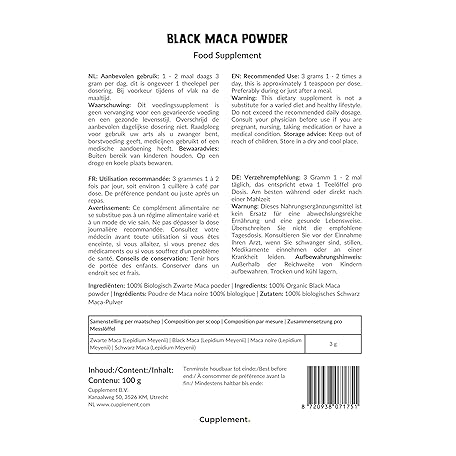 Thông tin sản phẩm Cupplement - Black Maca Powder 100 g - Organic - No Capsules, Arginine, Tablets, Extract or Yellow Carrot - Red - Superfood - High Dose - Peru - Root - Root