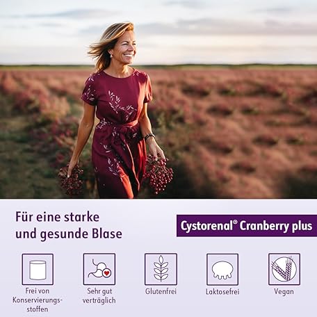 Thông tin sản phẩm Cystorenal Cranberry plus, 60 Capsules, 100% Vegan, with Extracts of Cranberry and Pumpkin, Vitamin B2 and Vitamin C, for a Healthy Bladder