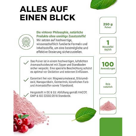 Thông tin sản phẩm D-Mannose Powder with Cranberry - 250 g Powder to Dissolve in Water - 100 Day Range - with Dosing Spoon - High Dosage, Vegan & Natural