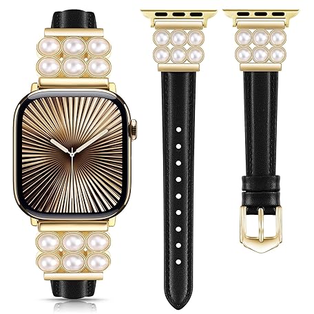 • DEALELE Armband Kompatibel mit Apple Watch 42mm 41mm 40mm 38mm, Glänzende Perlen Leder Ersatz Armbänder für iWatch Series 11/10 / 9/8 / 7/6 / 5/4 / 3 / SE, Schwarz -gold