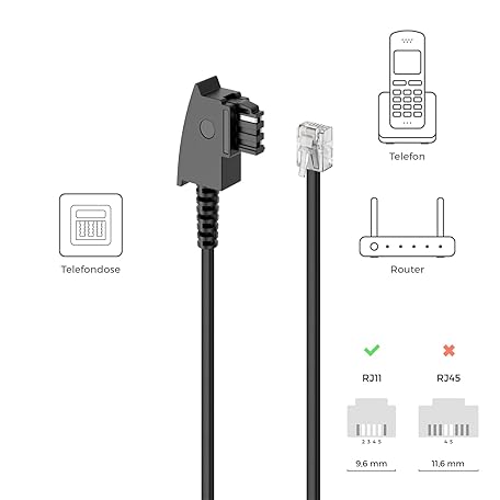 Thông tin sản phẩm deleyCON 1 m Telephone Cable, TAE-F Plug to RJ11 Plug, Int’l STD 6P4C Flat Cable for Analogue Devices to TAE-F Telephone Socket, Telephone, Fax, Modem, Router, Answering Machine, Black
