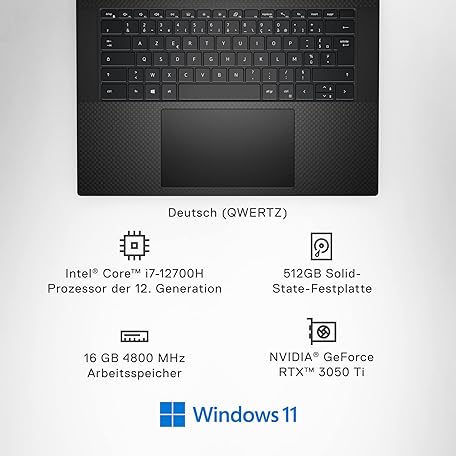 Thông tin sản phẩm Dell XPS 15 (9520) Laptop, 15.6 Inch UHD+ Touch 500 nits Display, Intel Core i7-12700H Processor, 16 GB RAM, 512 GB SSD, NVIDIA GeForce RTX 3050Ti, Windows 11 Home, QWERTZ Keyboard, Silver