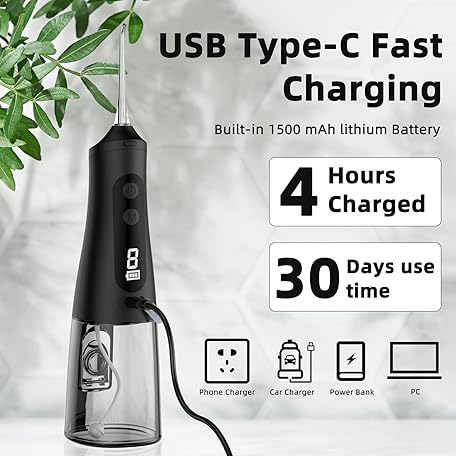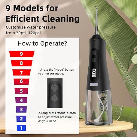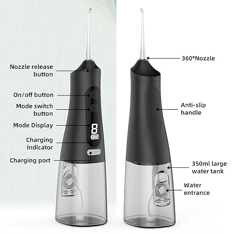 Thông tin sản phẩm Dental Floss for Teeth Cleaning, 9 Modes Rechargeable Oral Irrigator, 4 Tips, Powerful Battery Life, Water Toothpick, IPX7 Waterproof, 350ml Water Tank for Home and Travel (Black)