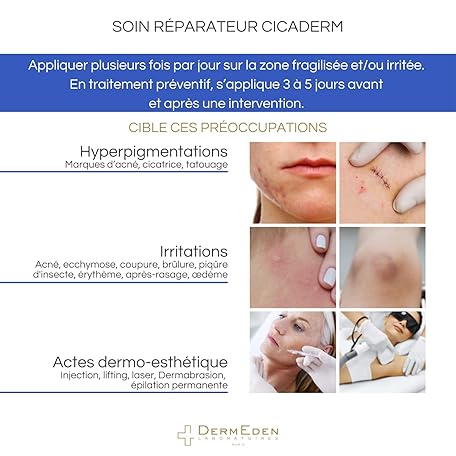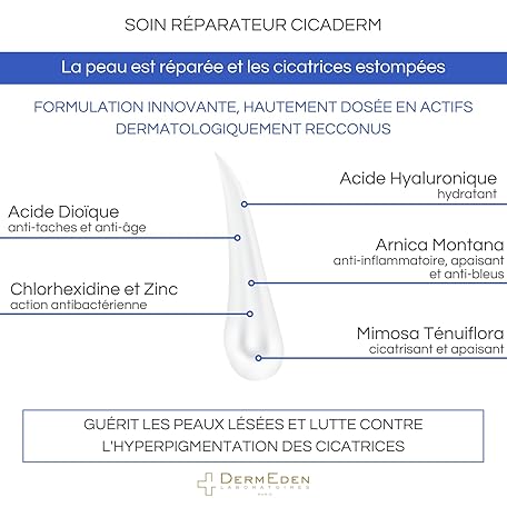 Sản phẩm DermEden - Repairing care Cicaderm 30 ml - Alcohol and perfume free - Repairs damaged and injured skin - Soothes, regenerates and promotes wound healing - French production đang được bán với giá ưu đãi là $23.1952 tại nước Đức.