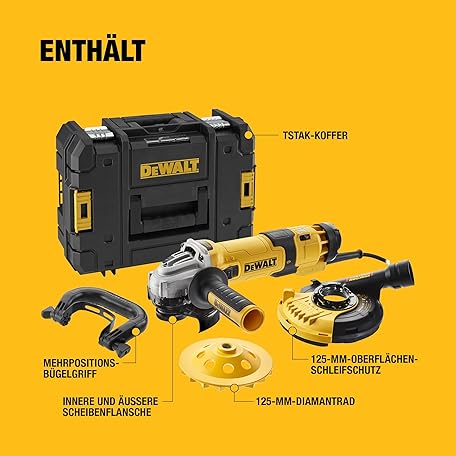 Sản phẩm Dewalt DWE4257KT-QS Electric Angle Grinder, 125 mm, 1500 W, Concrete, 2 W, 240 V đang được bán với giá ưu đãi là $278.168 tại nước Đức.