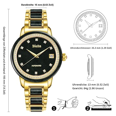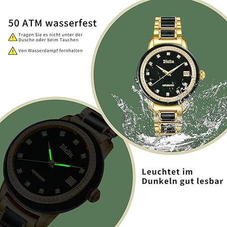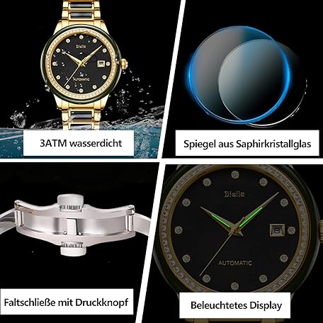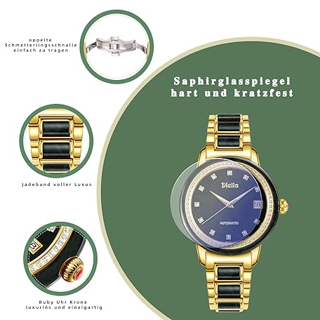 Thương hiệu Diella là cái tên nổi tiếng được rất nhiều khách hàng trên thế giới chọn lựa. Với kiểu dáng đẹp mắt, sang trọng, sản phẩm Diella Automatik Damen Uhr - Luxus Jade und Gold Edelstahl Armband, Wasserdicht Mechanische Uhr là sự lựa chọn hoàn hảo nếu bạn đang tìm mua một món cho riêng mình.