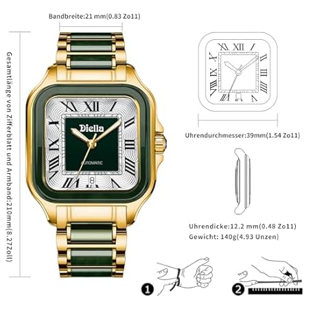 Thương hiệu Diella là cái tên nổi tiếng được rất nhiều khách hàng trên thế giới chọn lựa. Với kiểu dáng đẹp mắt, sang trọng, sản phẩm Diella Eckige Armbanduhr Männer, Herren Automatik Uhren Datumsanzeige, Schwarz Grün Jade & Edelstahl Herren Armband Uhren Wasserdicht (Modell: AD6027G) là sự lựa chọn hoàn hảo nếu bạn đang tìm mua một món cho riêng mình.