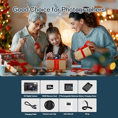 Thông tin sản phẩm Digital Camera 4K, 16X Autofocus Digital Zoom Camera, 48MP 3 Inch 180° Foldable LCD Screen HD Compact Vlog Camera with Charging Station, 2 Batteries, 32GB Card, Suitable for Beginners, Children