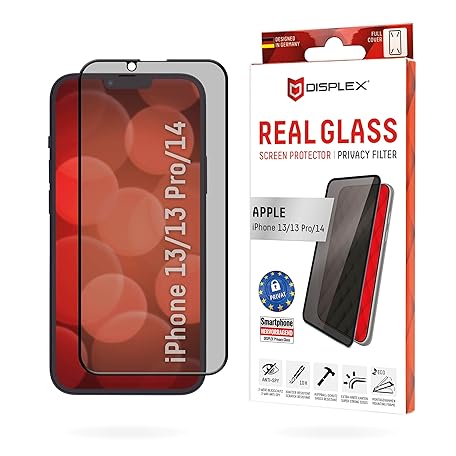 Displex Privacy Full Cover Tempered Glass (10H) for Apple iPhone 13/13 Pro/14/16e, Eco Mounting Frame, Privacy Filter, Tempered Glass, Scratch-Resistant Protective Film, Case-Friendly