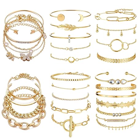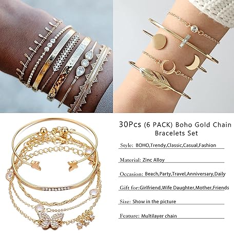 Sản phẩm Dochais Boho Gold Bracelets Set, Layered Bracelet, Adjustable, Stackable Bracelets, Women's Gold, Bohemian Multilayer Bracelet for Women, Girls, Pack of 30, Gold-plated alloy đang được bán với giá ưu đãi là $25.5169 tại nước Đức.