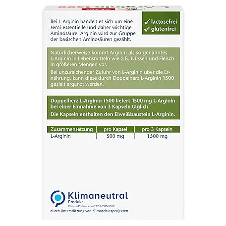 Sản phẩm Doppelherz L-Arginine 1500 - With the High-Quality Amino Acid L-Arginine - 30 Gluten and Lactose-free Capsules (Pack of 3) đang được bán với giá ưu đãi là $19.6636 tại nước Đức.