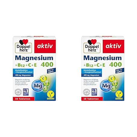 Doppelherz Magnesium 400 + B12 + C + E - Magnesium Supports Muscles and Nervous System - 30 Vegan Tablets (Pack of 2)
