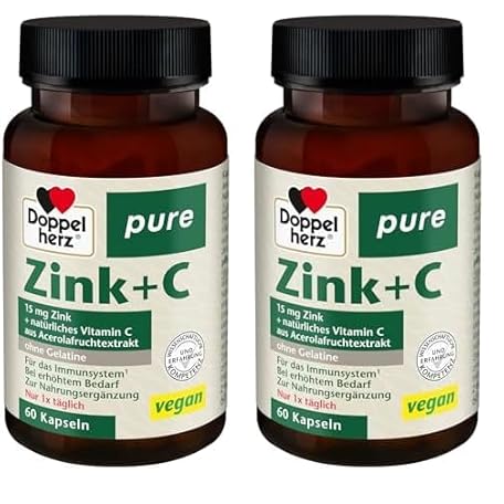 Doppelherz Pure Zinc + C - Vitamin C and Zinc contribute to the normal functioning of the immune system - 60 vegan capsules (Pack of 2)