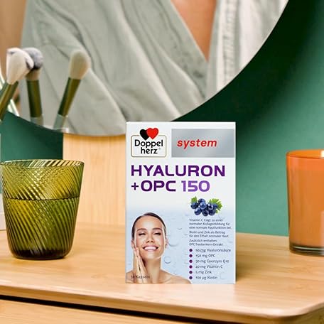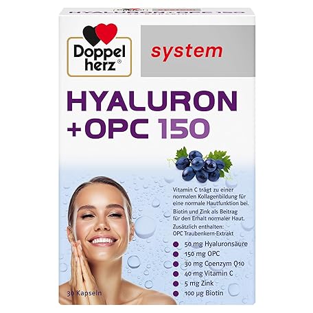 Sản phẩm Doppelherz System Hyaluronic + OPC 150: 50 mg Hyaluronic Acid + 150 mg OPC from Grape Seed Extract - Vitamin C as a Contribution to Normal Collagen Formation for Normal Skin Function, 30 Capsules đang được bán với giá ưu đãi là $19.3693 tại nước Đức.