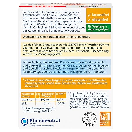 Sản phẩm Doppelherz Vitamin C 500 DIRECT Micro Pellets with DEPOT Effect - Dietary Supplement with Vitamin C and Zinc to Support the Immune System and Cell Protection - 1 x 20 Servings đang được bán với giá ưu đãi là $4.6652 tại nước Đức.