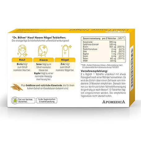 Thông tin sản phẩm Dr. BÖHM Skin Hair Nails - 60 Tablets - with Biotin, Zinc & Selenium, MSM - Silicon from Gold Millet & Silica - Lactose Free - Gluten Free
