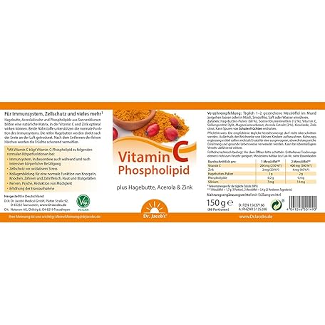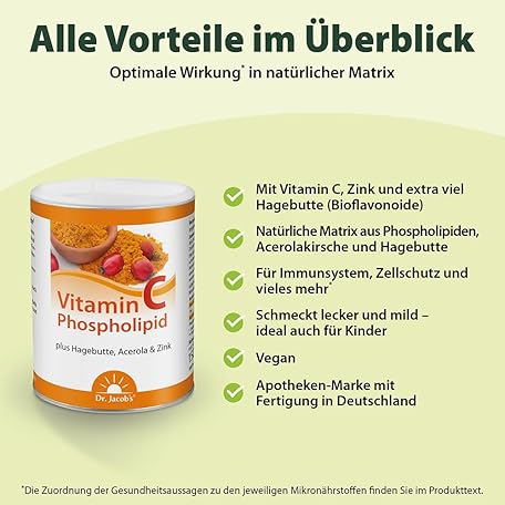 Sản phẩm Dr. Jacob's Vitamin C Phospholipid Tin 150 g I for Immune System and Nerves² I with Phospholipids, Zinc, Acerola Cherry and Rose Hip I Good Taste - Also Ideal for Children I 88 Servings đang được bán với giá ưu đãi là $20.2413 tại nước Đức.