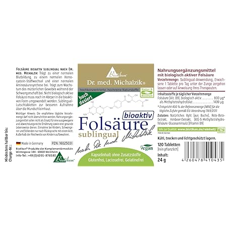 Sản phẩm Dr. Michalzik Bioactive Folic Acid (Vitamin B9) – 120 Tablets – 800 Micrograms per Tablet Bioactive Folic Acid – No Additives BIOTIKON® đang được bán với giá ưu đãi là $25.0482 tại nước Đức.