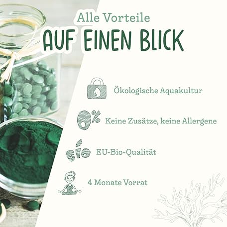Thông tin sản phẩm dreikraut Bio Spirulina Presslinge, 750 Tabletten, 4-Monats-Vorrat, aus kontrollierter Aquakultur, rückstandsgeprüft