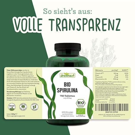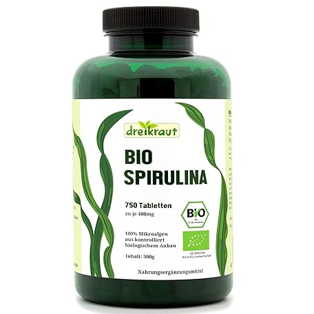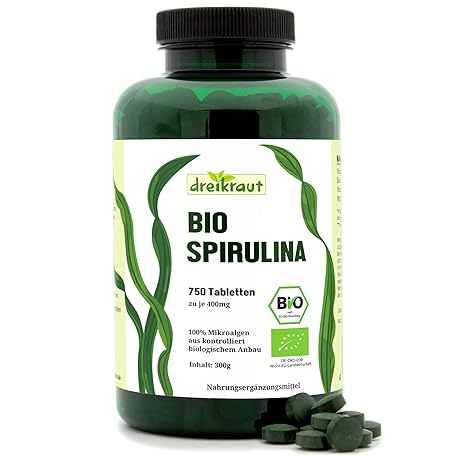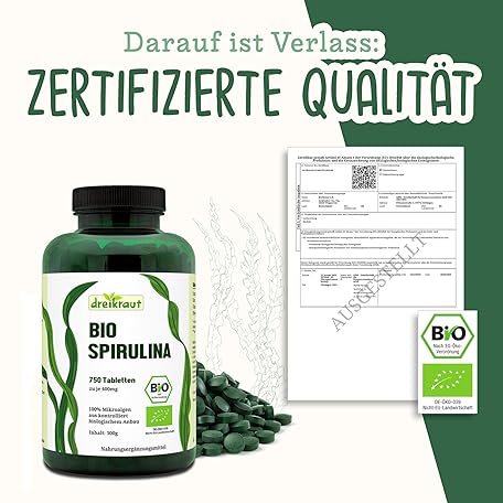 Sản phẩm dreikraut Bio Spirulina Presslinge, 750 Tabletten, 4-Monats-Vorrat, aus kontrollierter Aquakultur, rückstandsgeprüft đang được bán với giá ưu đãi là $19.9797 tại nước Đức.