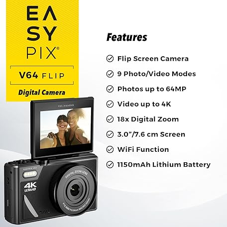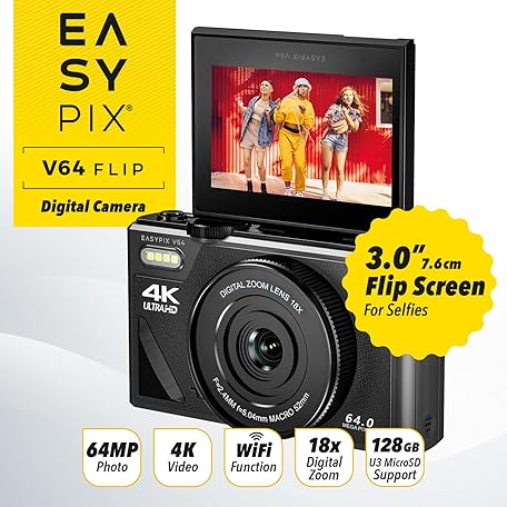 Thông tin sản phẩm Easypix V64 Flip, Digital Camera with Flip Screen, Hinged 3.0 Inch Display, Resolution up to 64 MP, 18x Digital Zoom, WiFi, Perfect for Vlogger and Selfie Shooting